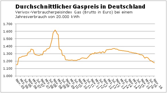 Der Verivox-Verbraucherpreisindex sank im Vergleich zum Vormonat um 0,4 Prozent und erreichte im November erstmals das 10-Jahres-Tief von 1.180 Euro. Diese Summe bezahlt ein Haushalt mit einem Jahresverbrauch von 20.000 Kilowattstunden (kWh) aktuell im bundesdeutschen Durchschnitt. Ein vergleichbarer Wert wurde zuletzt im Dezember 2005 erreicht. Damals lagen die durchschnittlichen Gaskosten bei 1.156 Euro.