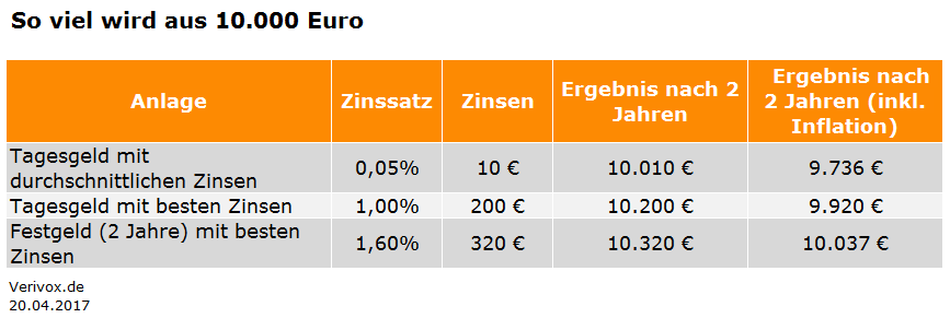 Was bleibt also an Kaufkraft übrig nach Abzug der Teuerungsrate? Eine Modellrechnung mit 1,4 Prozent* Inflation in den kommenden 2 Jahren zeigt: Aus 10.000 Euro würden 9.736 Euro bei einem durchschnittlichen Tagesgeld – real ein Verlust von 264 Euro. Beim besten Tagesgeld blieben immerhin 9.920 Euro übrig. Erst mit dem bestverzinsten 2-jährigen Festgeld verdient der Anleger weiter Geld – 10.037 Euro hat er real am Ende.