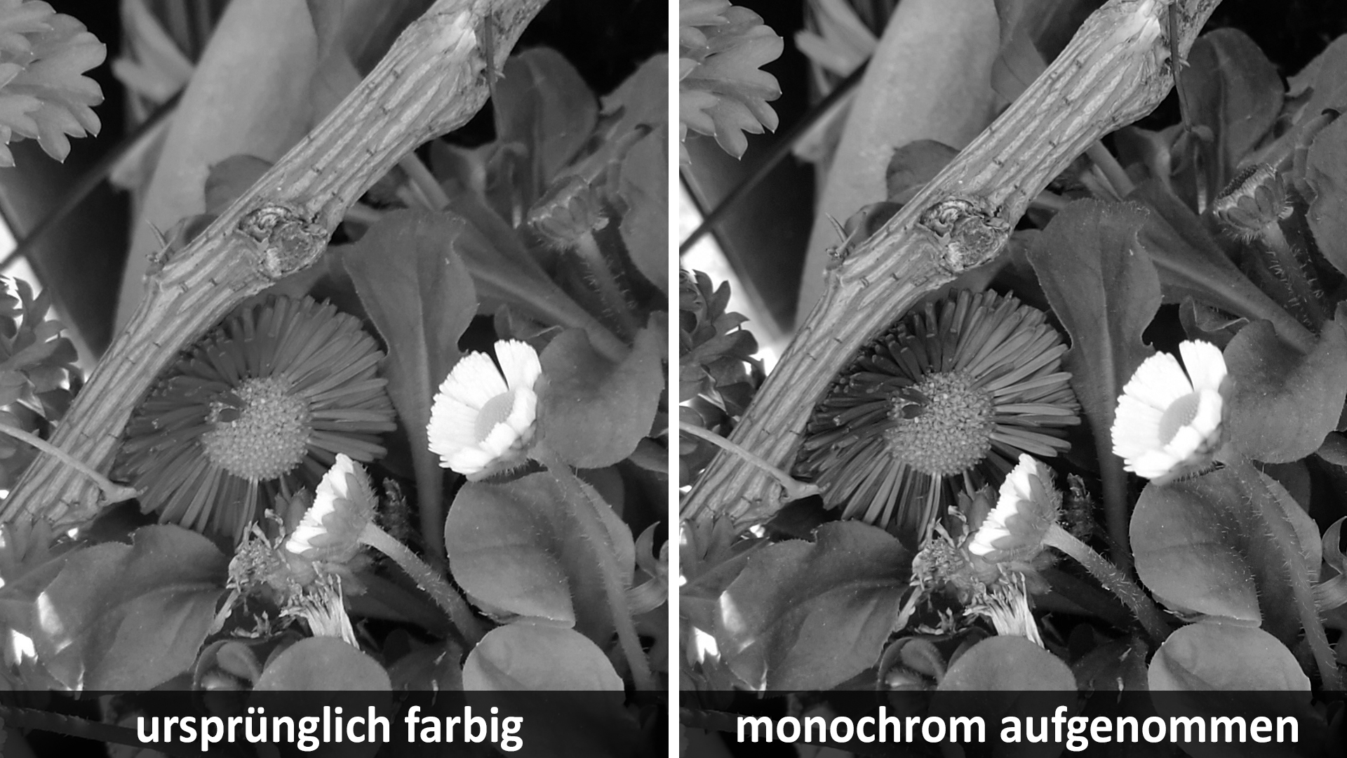 Und da sind die Unterschiede schon offensichtlich: Alle Objekte weisen kräftigere Kontraste auf, teilweise auch mehr Details. Man vergleiche beispielsweise den Ast oder die große, dunkle Blüte direkt darunter oder auch die feinen Härchen am Stängel in der rechten unteren Ecke. Am deutlichsten aber wird der Vorteil des Schwarz-Weiß-Sensors an der noch geschlossenen Blüte am rechten Rand im oberen Drittel: Was da an Schärfe, Kontrast und Details erkennbar ist, wo die ursprünglich farbige Aufnahme links schon recht matschig wirkt – beeindruckend! Kurzum: Das Konzept der P9-Kamera macht vollauf Sinn.