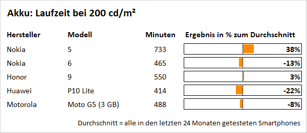 Der fest verbaute Stromspeicher des Nokia 5 fasst 2.900 Milliamperestunden und schafft damit im Laufzeittest bei der Videowiedergabe mit auf 200 Candela gedimmtem Bildschirm im Flugmodus 682 Minuten: Das sind saubere 28 Prozent mehr als im Schnitt. Damit dürften sogar viele Intensivnutzer durch den Tag kommen, ohne zwischentanken zu müssen. Normalnutzer werden vermutlich sogar zwei Tage mit einer Ladung auskommen. Das sieht beim Nokia 6 und seinen 465 Minuten ganz anders aus: Der Akku macht 13 Prozent früher schlapp als üblich, da kann es sogar für Normalnutzer eng werden, sollte sich der Tag einmal etwas arbeitsreicher gestalten. Die hervorragende Akkulaufzeit des Nokia 5 stellt also einen gigantischen Vorteil im Vergleich zum Nokia 6 dar.