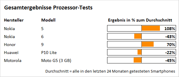 Als Rechen-Chip werkelt im Nokia 5 exakt der gleiche Prozessor wie im Nokia 6, also der Snapdragon 430 von Qualcomm. Dessen acht Kerne sind zur Hälfte mit 1,4 und 1,1 Gigahertz getaktet, Unterstützung findet er im Grafikmodul Adreno 505. Einziger Unterschied: Im kleinen Nokia stecken 2 statt 3 Gigabyte Arbeitsspeicher. Damit erzielt der Kandidat in der Gesamtwertung von mehr als 50 erfassten Einzelwerten aus 15 verschiedenen Benchmarks ein Ergebnis, das 38 Prozent unter dem Durchschnitt liegt. Damit schippert er auf demselben Niveau wie das Nokia 6.