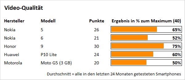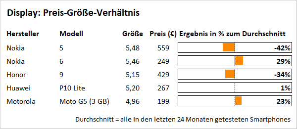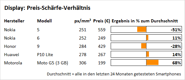 Wer auf Videos verzichten kann, findet im Nokia 5 ein solides Smartphone mit nativem Android und monatlichen Sicherheits-Updates, das zwar nicht ganz so zügig reagiert wie Topmodelle, dafür aber auch mit lediglich 200 Euro zu Buche schlägt. Aufgrund der vergleichsweise geringen Kosten startet der Finne im Preis-Leistungs-Verhältnis sage und schreibe 54 Prozent über dem Durchschnitt; die meisten Neuheiten steigen zwischen 30 und 60 Prozent unter dem Mittel ein. Käufer erhalten also beim Nokia 5 weit mehr für ihr Geld als üblich. Sofern man sich mit den genannten Einschränkungen arrangieren kann, stellt der Finne ergo eine gute Wahl dar.