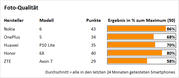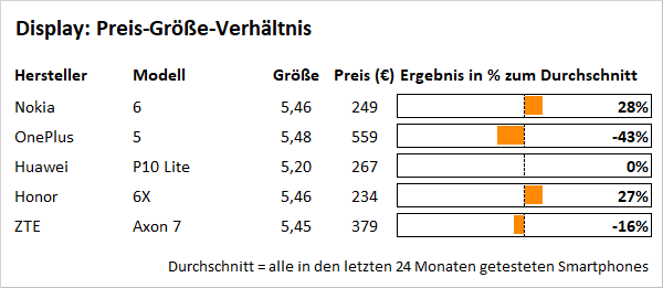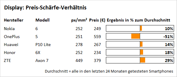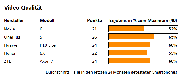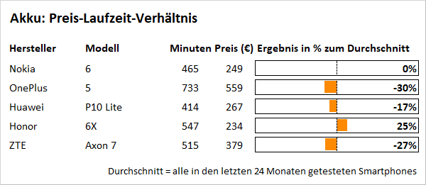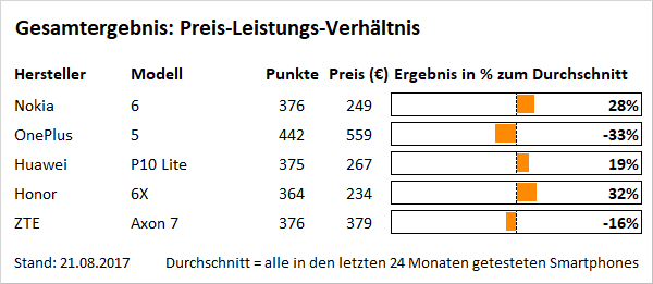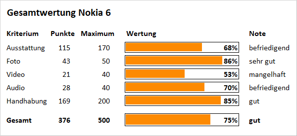 Aufgrund des vergleichsweise niedrigen Preises startet das Nokia 6 trotzdem 28 Prozent über dem Mittel im Preis-Leistungs-Verhältnis; die meisten Neuheiten der Mittel- und Oberklasse steigen hingegen 30 bis 60 Prozent unterdurchschnittlich ein. Das Resultat des Probanden ist also richtig gut! Moderate Nutzer, die auf Videos so gut wie verzichten können, dürfen das Nokia 6 daher durchaus in die engere Wahl ziehen.