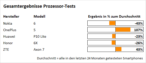 Als Rechen-Chip haben die Entwickler den Snapdragon 403 gewählt, dessen 8 Kerne zur Hälfte mit 1,4 und 1,1 Gigahertz getaktet sind. Unterstützt wird er von 3 Gigabyte Arbeitsspeicher, was in dieser Preisklasse spendabel ist. Damit erzielt der Kandidat in der Gesamtwertung von mehr als 50 Einzelwerten aus 15 verschiedenen Benchmarks ein Ergebnis, das 43 Prozent unter dem Durchschnitt rangiert. Zu wenig, wenn man maximale PS unter der Haube haben will, für reguläre Aufgaben hingegen reicht das locker.