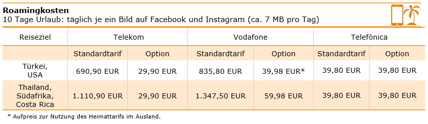 Verivox hat anhand eines Musterprofils berechnet, welche Roamingkosten bei den drei Netzbetreibern jeweils im voreingestellten Tarif und in der zubuchbaren Auslandsoption anfallen. Der Musterurlauber ist zehn Tage auf Reisen in der Türkei oder den USA bzw. in Südafrika, Thailand oder Costa Rica. Er postet an zehn Tagen täglich je ein Bild auf Facebook und auf Instagram. Hierbei wurde ein Gesamtdatenbedarf von etwa 70 Megabyte ermittelt – wer zusätzlich noch telefoniert oder mit Freunden und Followern kommuniziert, zahlt noch mehr.