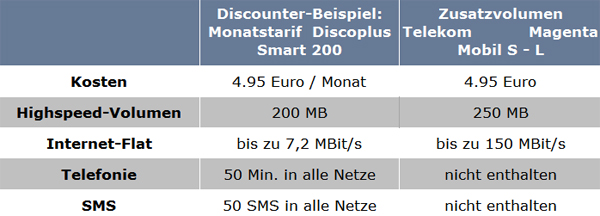 Für 250 Megabyte extra verlangen die Netzbetreiber zwischen 3 und 5 Euro, manche Discounter sogar 6 Euro. Wer mehr Daten nachbucht, zahlt bis zu 15 Euro für knapp 2 Gigabyte. Komplette Monatstarife hingegen, die zusätzlich zum Datenbudget auch 50 Telefonminuten und 50 SMS beinhalten, gibt es schon für unter 5 Euro.