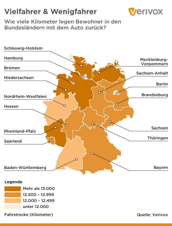 Verivox-Nutzer in Mecklenburg-Vorpommern legen im Schnitt mehr als 13.700 Kilometer jährlich zurück und liegen damit deutlich über dem Durchschnitt von etwa 12.400 Kilometern. Über 13.000 Kilometern liegen auch Rheinland-Pfalz und die Nordländer Schleswig-Holstein und Niedersachsen. In die Auswertung sind die Zahlen von privat genutzten Fahrzeugen eingeflossen, Firmenfahrzeuge wurden nicht berücksichtigt.