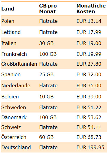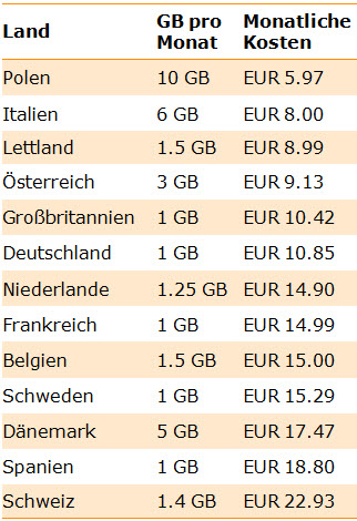 So sind beispielsweise in Frankreich und Italien zwar keine „echten“ Flatrates erhältlich, jedoch sehr große Datenpakete zu recht niedrigen Preisen (Frankreich: 100 GB für 20 Euro, Italien: 30 GB für 19 Euro). In Deutschland gibt es zum Beispiel 14 GB (bei Vodafone) für 72 Euro: Dieses Paket mit 14 GB ist damit sogar teurer als eine unlimitierte Flatrate in sechs europäischen Ländern.
