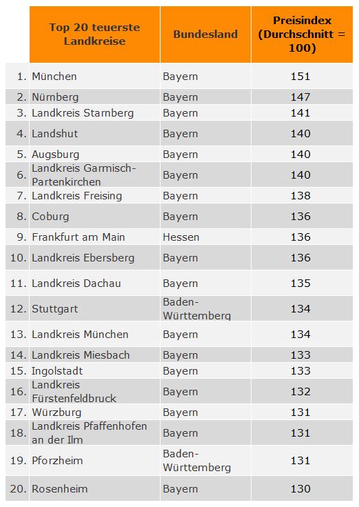 Bayern dominiert die Top 20 der teuersten Landkreise
