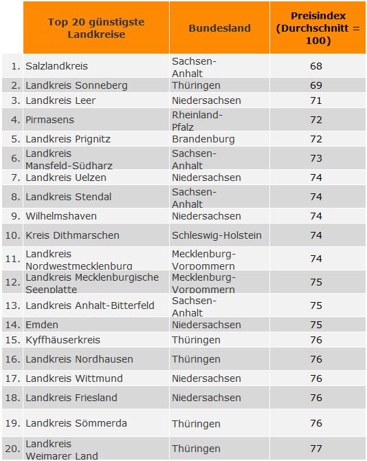 In den Landkreisen in Ostdeutschland liegt der Preis für die Kfz-Versicherung überwiegend unter dem Durchschnitt. Am wenigsten zahlen Autofahrer im Salzlandkreis (68) in Sachsen-Anhalt und im Landkreis Sonneberg (69) in Thüringen. Insgesamt befinden sich unter den 20 günstigsten Landkreisen zwölf in Osten der Republik. Hier haben die Landkreise fast flächendeckend günstige Regionalklassen in der Haftpflicht. Das senkt die Preise. Auch in niedersächsischen Landkreisen wie Leer (71) und Uelzen (74) gibt es die Kfz-Versicherung sehr preiswert.