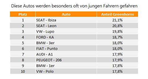 Jung, jünger, Seat – der spanische Autobauer führt das Ranking beim Anteil der jungen Fahrer mit gleich zwei Modellen an. Jeder fünfte Fahrer eines Seat Ibiza oder Seat Leon ist unter 30. Im Durchschnitt aller Modelle macht diese Kundengruppe nur ein Zehntel aus.