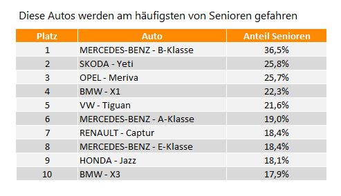 Je reifer, desto eher ein Mercedes: Gleich drei Mercedes-Modelle liegen in den Top 10 der Rentnerautos, also der Modelle mit den höchsten Anteilen von Besitzern über 65 Jahren. Das mit Abstand beliebteste Modell ist die Mercedes B-Klasse mit einem Anteil der Senioren von 36,5 Prozent. Zum Vergleich: Insgesamt lag der Anteil der Fahrer über 65 bei 10,5 Prozent.