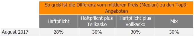 Verglichen wurden die drei günstigsten Tarife jedes Vergleichs mit dem mittleren Preis (Median). Dabei lagen die Top-Preise in der reinen Haftpflichtversicherung 28 Prozent unter dem Mittelfeld. Bei Nutzern, die auch eine Vollkasko oder Teilkasko abschließen wollten, betrug die Differenz 30 Prozent.