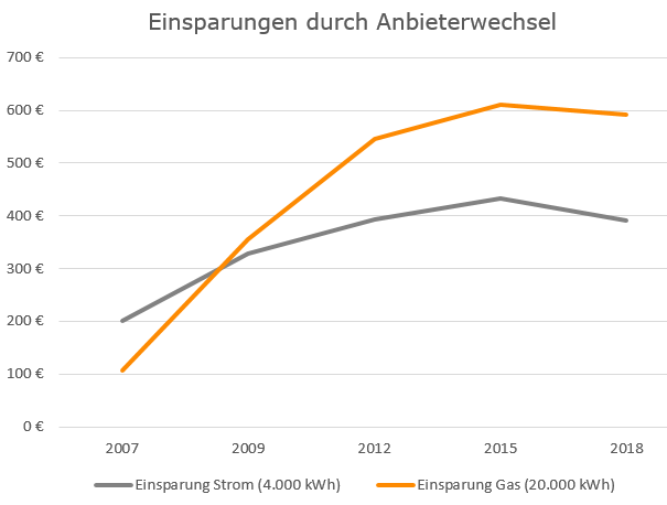 Auch die Sparmöglichkeiten haben sich im Bereich Gas schneller und stärker entwickelt als beim Strom. Das Preisgefälle zwischen der örtlichen Grundversorgung und dem günstigsten Tarif lag im Jahr 2007 bei durchschnittlich 100 Euro. Die Verivox-Auswertung aktueller Gaspreise für 2018 zeigt indes einen Preisunterschied von fast 600 Euro.