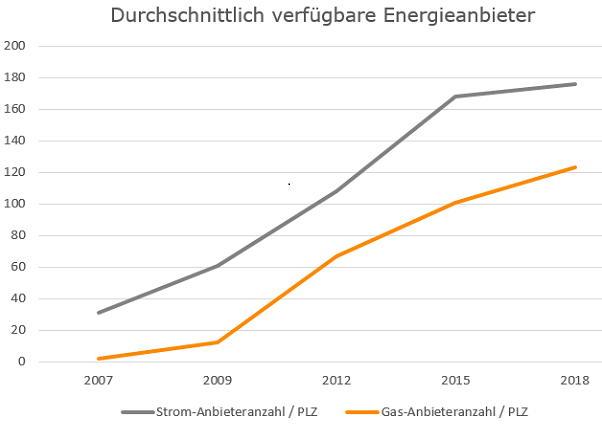 Dennoch ist die Auswahl für private Stromverbraucher deutlich größer geworden. 2007 konnten Verbraucher nur aus durchschnittlich 31 verschiedenen Anbietern wählen. Zu Beginn des Jahres 2018 standen pro Postleitzahlengebiet durchschnittlich 176 Anbieter zur Auswahl. Damit hat sich das Angebot fast versechsfacht.
