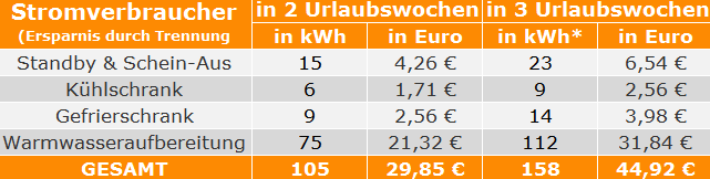Viele Elektrogeräte ziehen auch nach dem Ausschalten heimlich und unbemerkt Strom. Das gilt besonders für Fernseher, Stereoanlage, Waschmaschine, PC und Drucker. Um der Standby-Falle zu entkommen, hilft nur den Netzstecker zu ziehen. In zwei Urlaubswochen spart eine Familie so rund 15 Kilowattstunden Strom ein. Das entspricht rund 4 Euro. In drei Wochen beläuft sich die Ersparnis auf 23 kWh oder rund 6,50 Euro mehr in der Urlaubskasse.