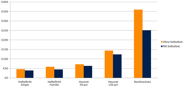 So kann beispielsweise ein Single den Preis für seine Privathaftpflicht nur um knapp 7 Euro senken, wenn er eine Selbstbeteiligung vereinbart. Das entspricht 15 Prozent. Die Familie spart 13 Euro oder 23 Prozent. Auch beim Hausratvertrag sind die Unterschiede relativ gering. 9 Euro günstiger ist der Vertrag mit Selbstbeteiligung für eine 50-Quadratmeter-Wohnung in Berlin und 20 Euro für eine 150-Quadratmeter-Wohnung in Augsburg.